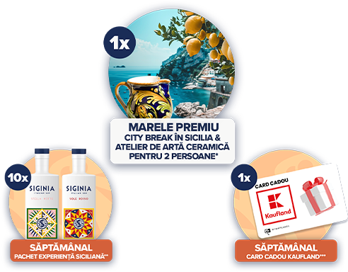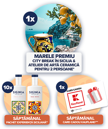 În perioada 15.05.2025 - 15.07.2025, cumpără minimum un produs Siginia Italian Gin participant din magazinele fizice din rețeaua Kaufland de pe teritoriul României, înscrie data și numărul bonului fiscal pe website-ul www.siginia-gin.com/Kaufland sau scanează codul QR și poți câștiga prin tragere la sorți unul dintre premiile campaniei.
